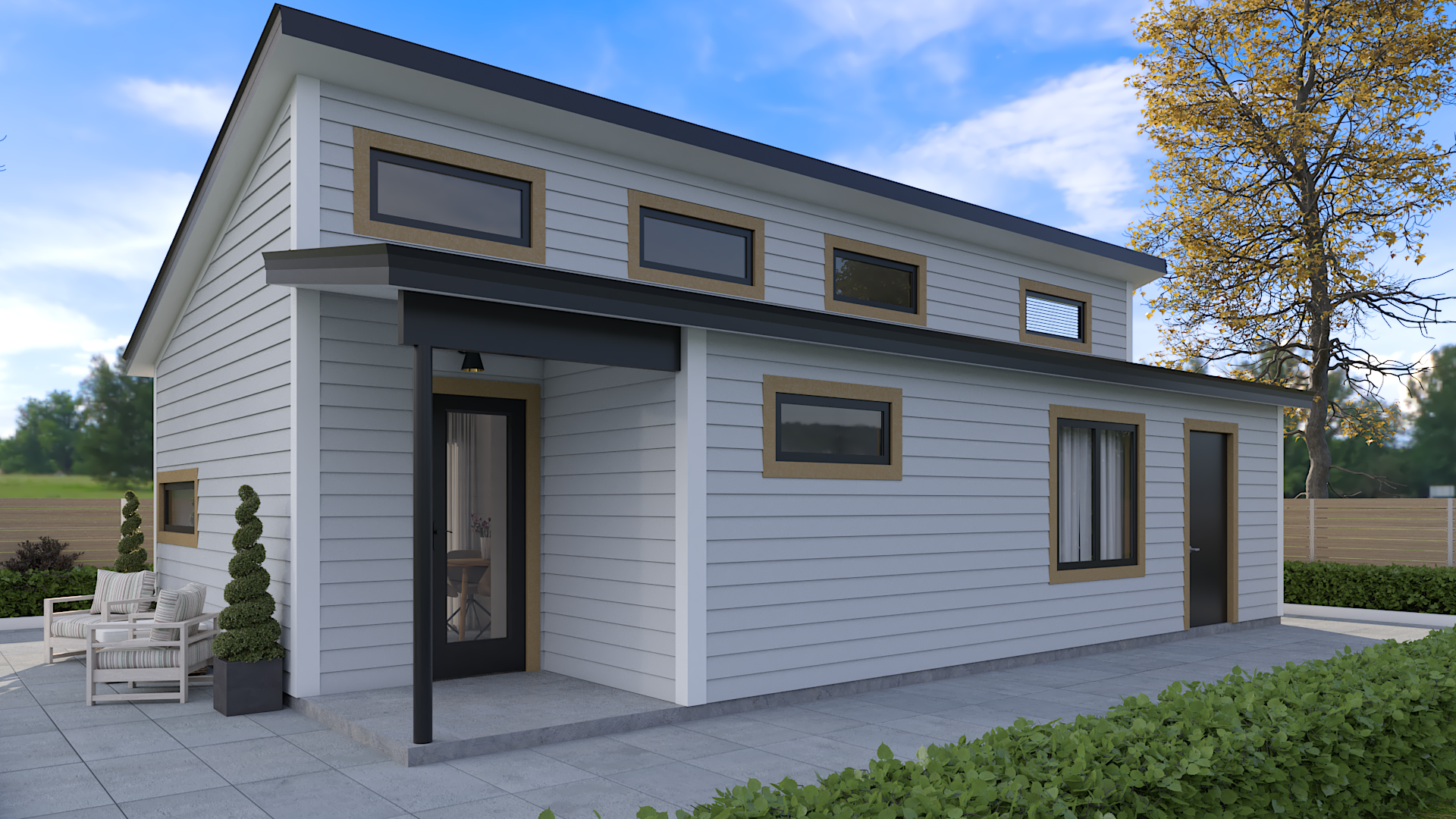 The ZNDR is a modern design with 1 bedroom, 1 bathroom, and 460 heated sf. It features vaulted ceilings, clerestory windows, a storage loft, a small kitchen, a laundry nook, a workshop, and screened porch. Like all BSIDE Models, the ZNDR is built from super-insulated panels and incorporates accessibility features throughout.